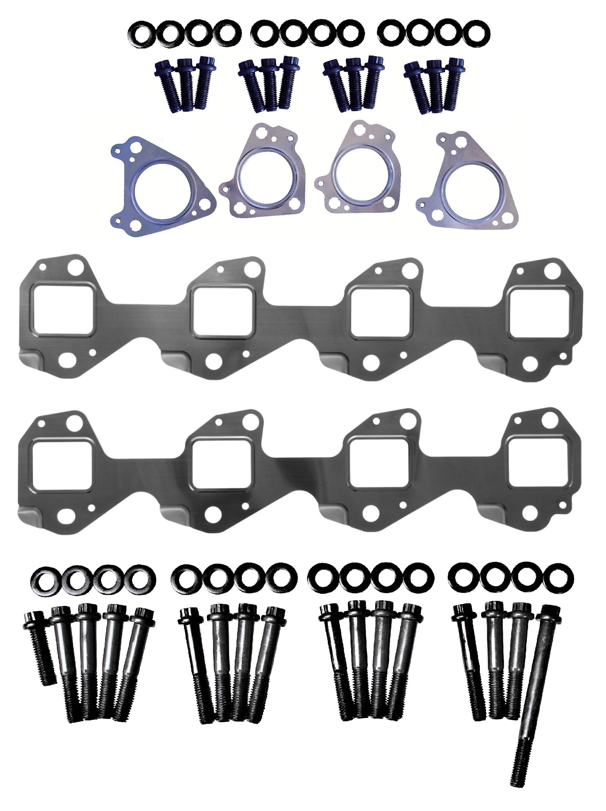 Exhaust manifold and up pipe gasket and bolt set for factory exhaust manifolds & up pipes on 2001-2016 Chevy/GMC 6.6l Duramax engines.